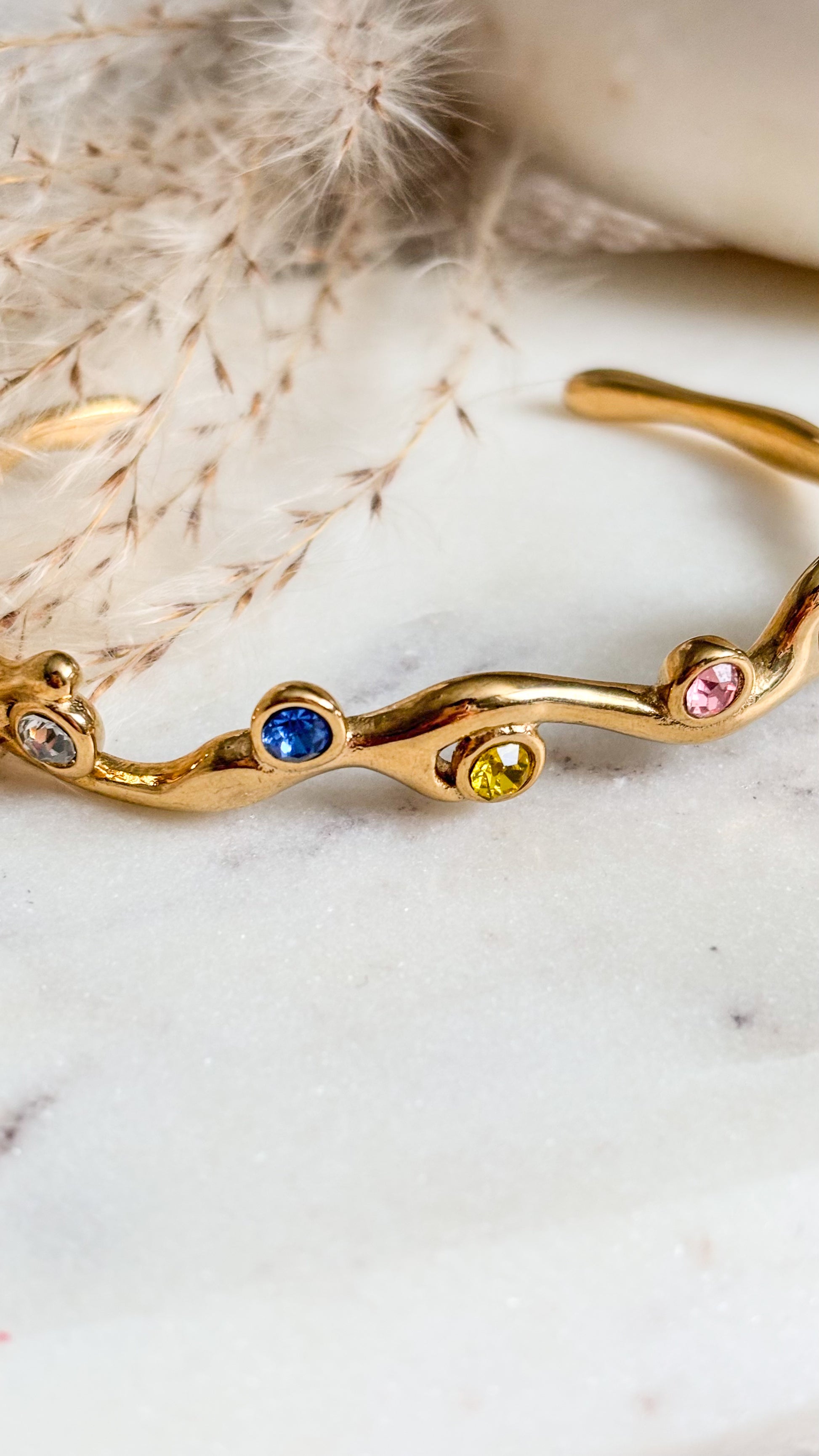 Bangle Abierto con Zirconias en Colores. Cada detalle en stainless steel de excelente calidad y piedras brillantes aporta un toque alegre y moderno.