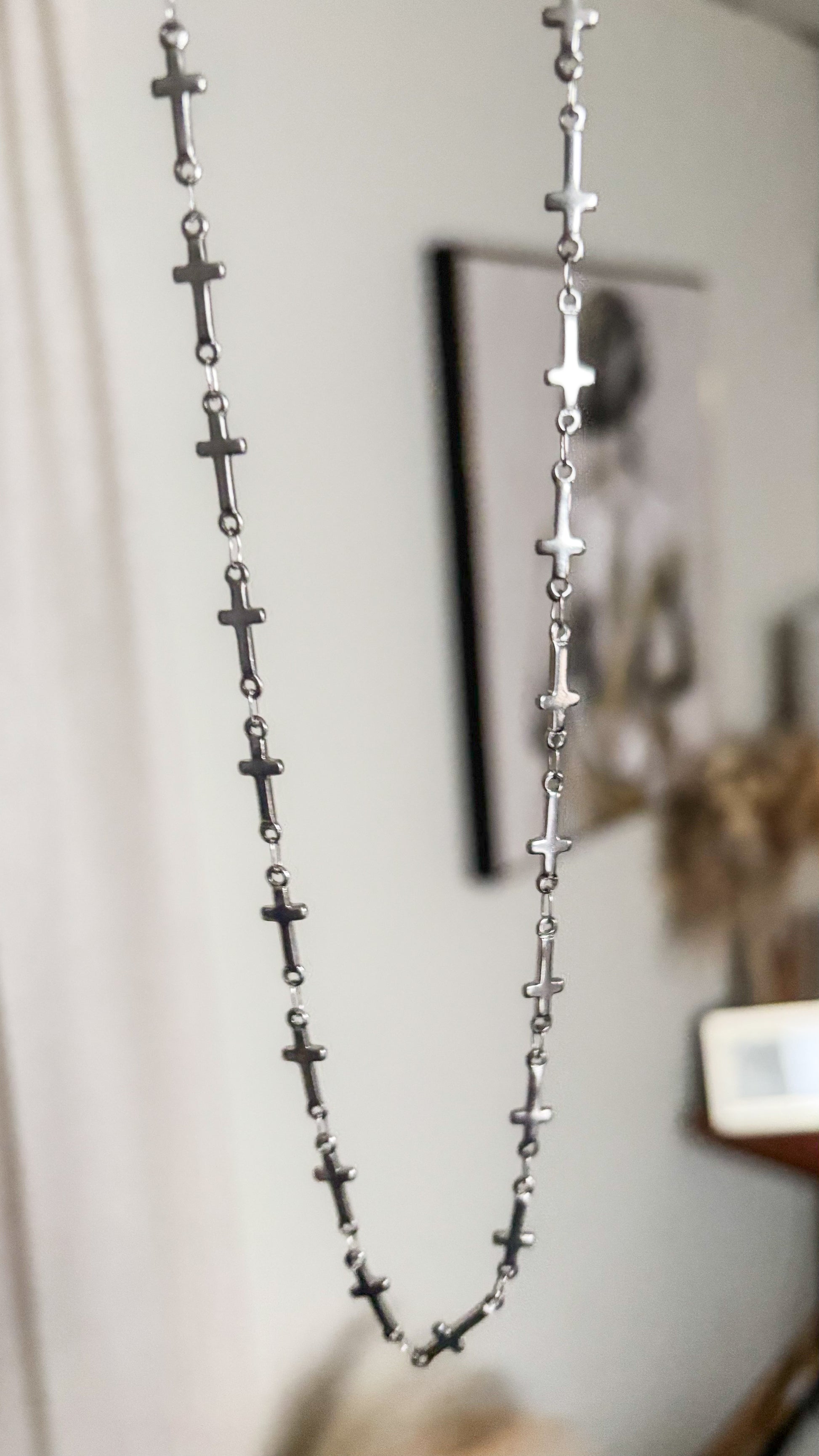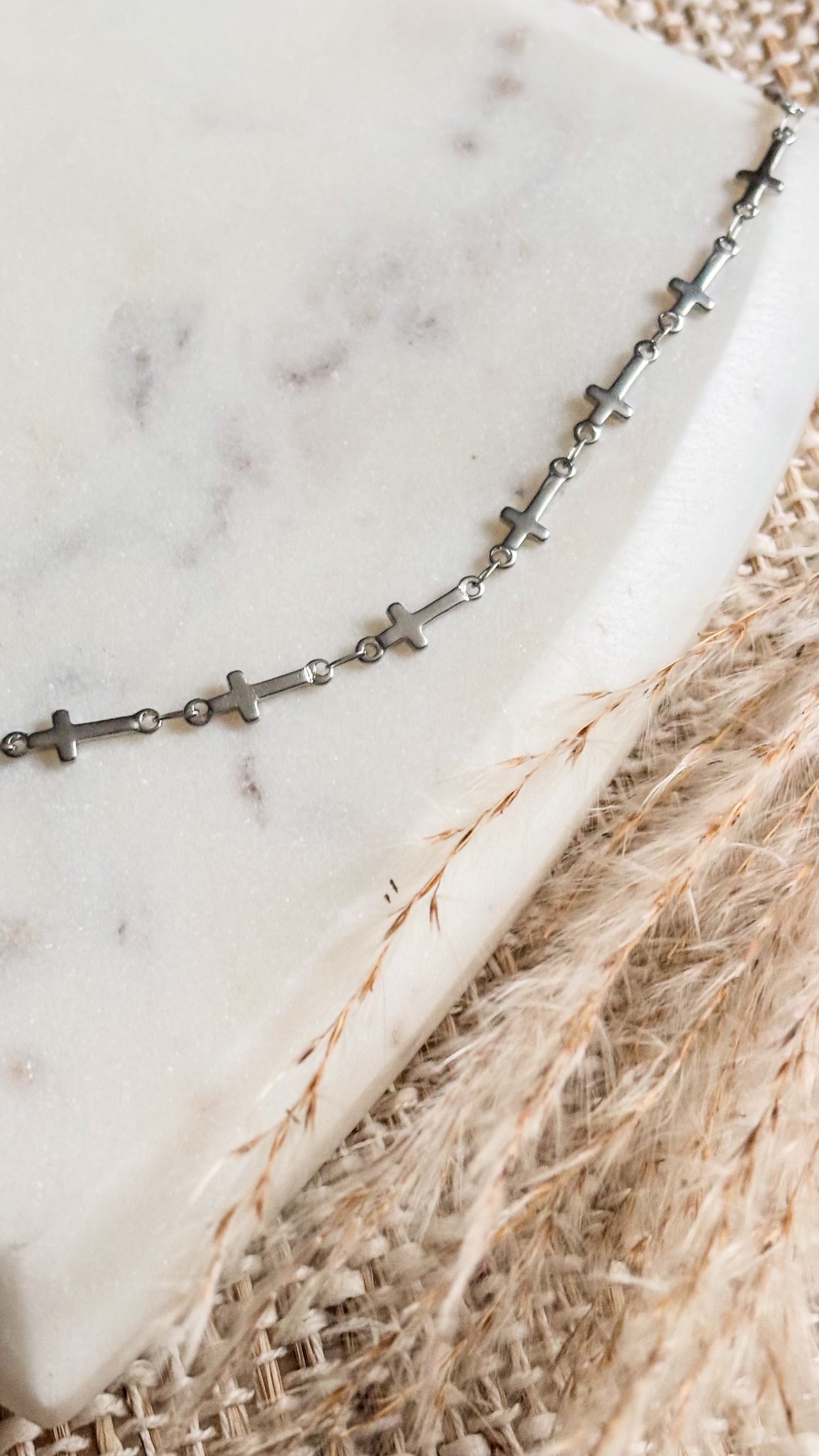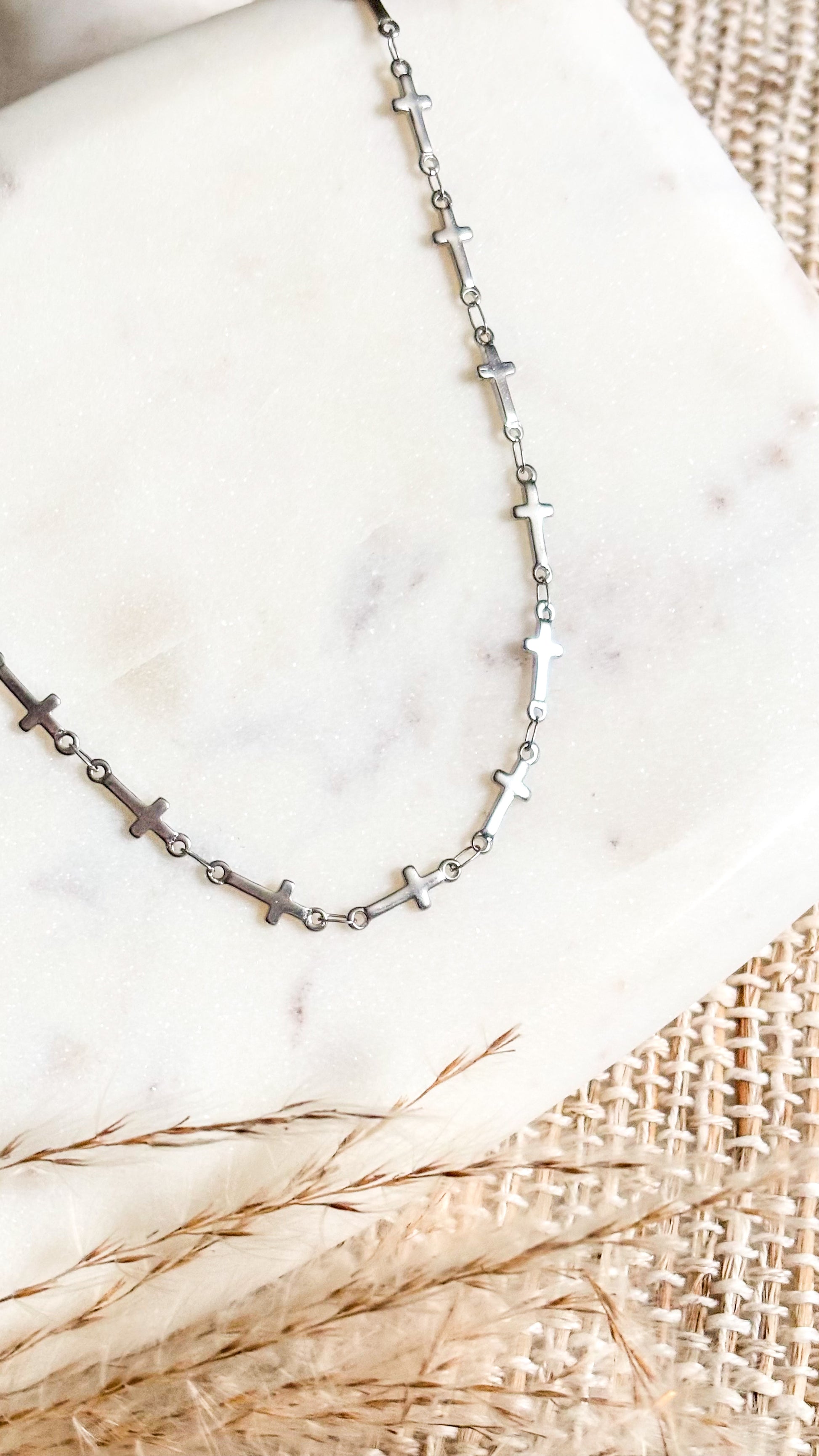 La Cadena Camino en Fé es un collar lleno de propósito. Sus múltiples cruces plateadas representan cada paso que Jesús camina contigo, cada oración contestada y cada momento en el que su amor te sostiene.