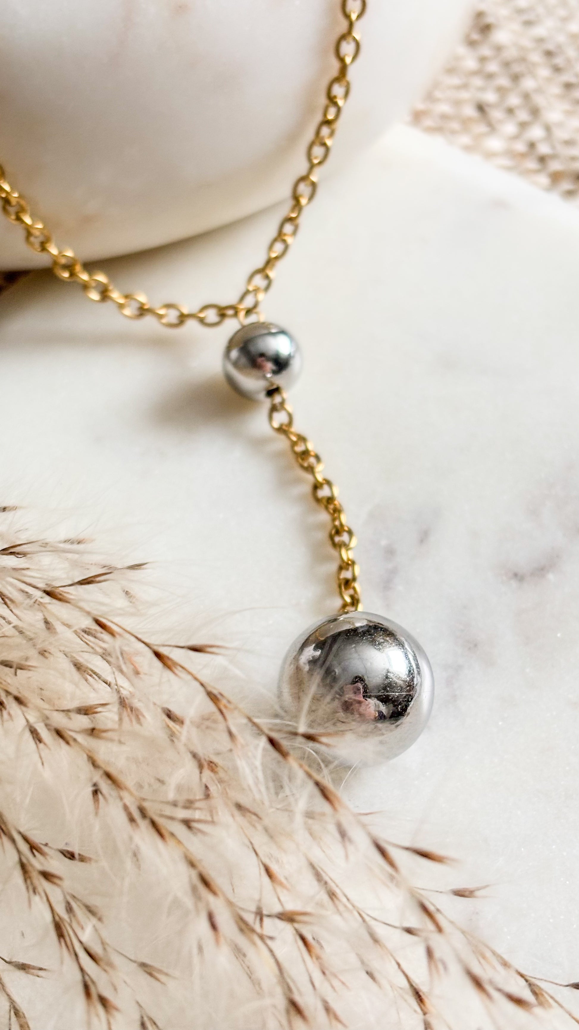 Elegante y moderno, este collar de 16”+ 2"ext. en stainless steel combina acabados en dos tonos: la cadena en oro y las bolitas decorativas en silver.