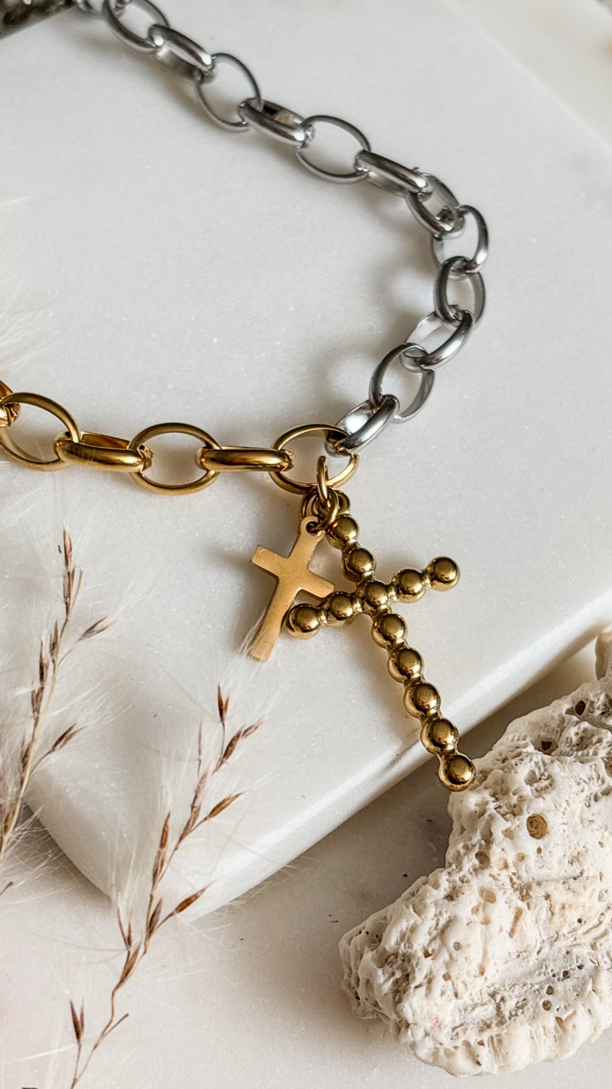 Diseñado con un elegante contraste de dos tonos: mitad color silver y mitad color oro. Esta pieza destaca por sus dos cruces, una más grande que la otra, simbolizando la protección, la fe y la conexión espiritual que llevamos siempre con nosotros.