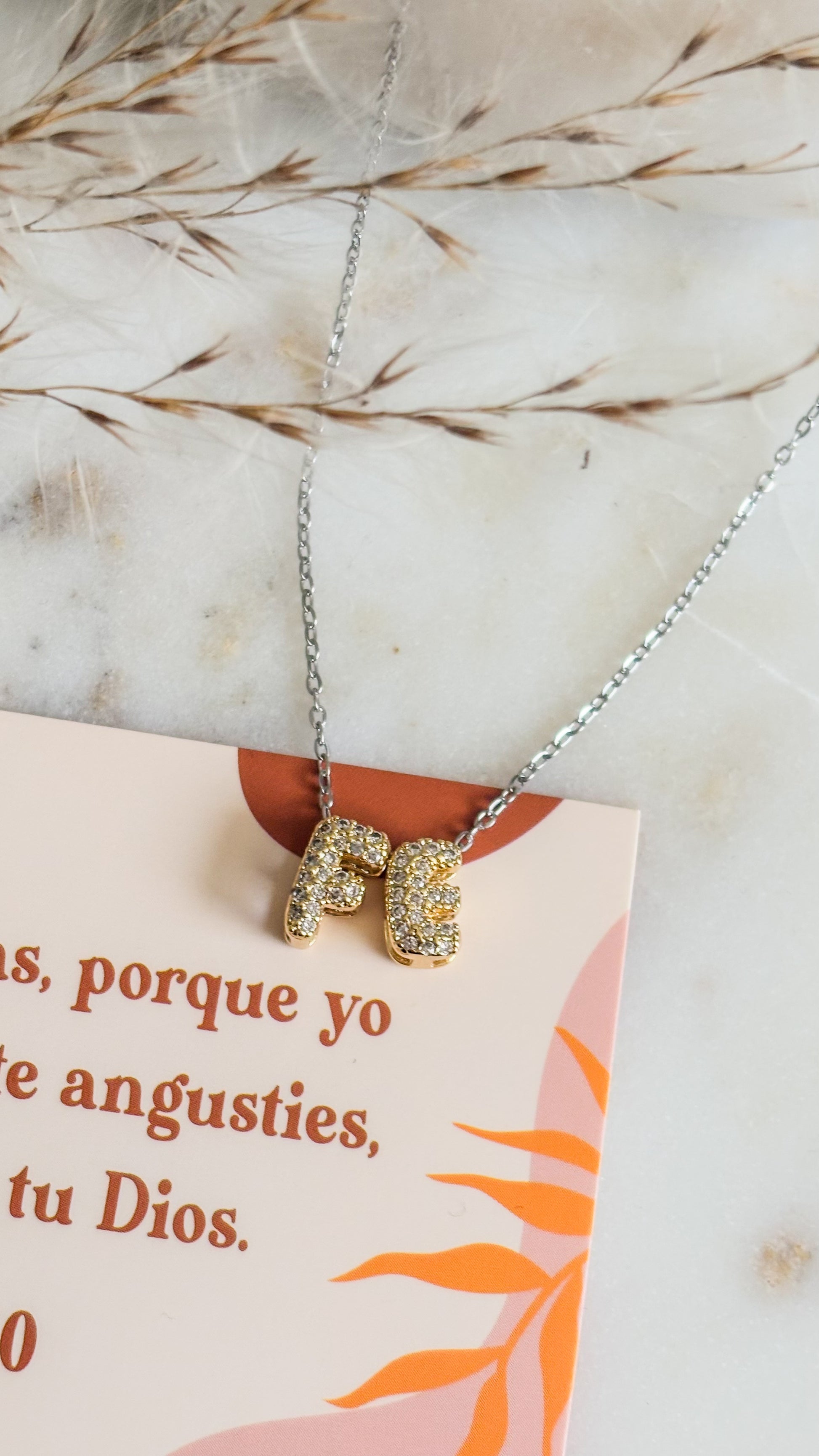 Una pieza delicada que habla sin decir una palabra. Este collar en acero inoxidable color silver lleva el poderoso mensaje “Fe” en tono oro, adornado con zirconias que aportan un brillo sutil y elegante.